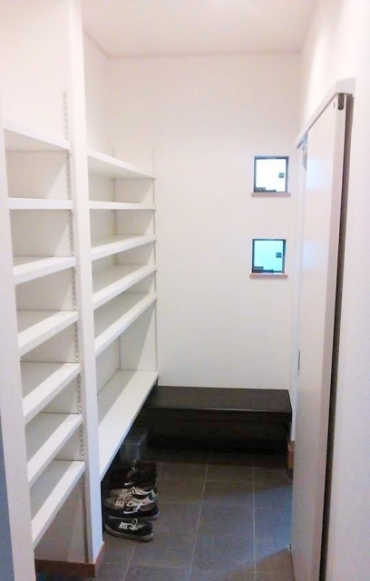 人が中に入って靴を脱ぎ履きしたり、物を収納したりできる広さがあります。