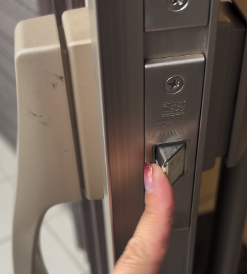 ところが今回施工したお客様宅のラッチは、写真のようにハンドル部分に触れていない状態でも▷部分が沈み込んでしまう状態でした。